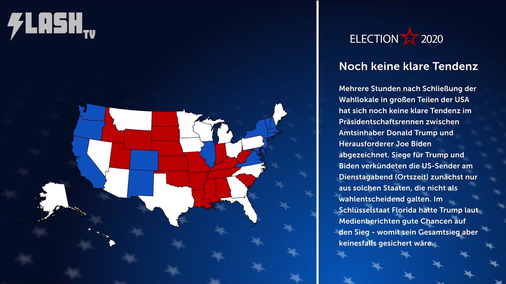 Mehrere Stunden nach Schließung der Wahllokale in großen Teilen der USA hat sich noch keine klare Tendenz im Präsidentschaftsrennen zwischen Amtsinhaber Donald Trump und Herausforderer Joe Biden abgezeichnet. Siege für Trump und Biden verkündeten die US-Sender am Dienstagabend (Ortszeit) zunächst nur aus solchen Staaten, die nicht als wahlentscheidend galten. Im Schlüsselstaat Florida hatte Trump laut Medienberichten gute Chancen auf den Sieg – womit sein Gesamtsieg aber keinesfalls gesichert wäre.